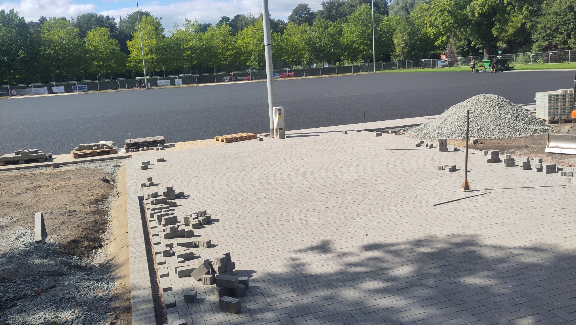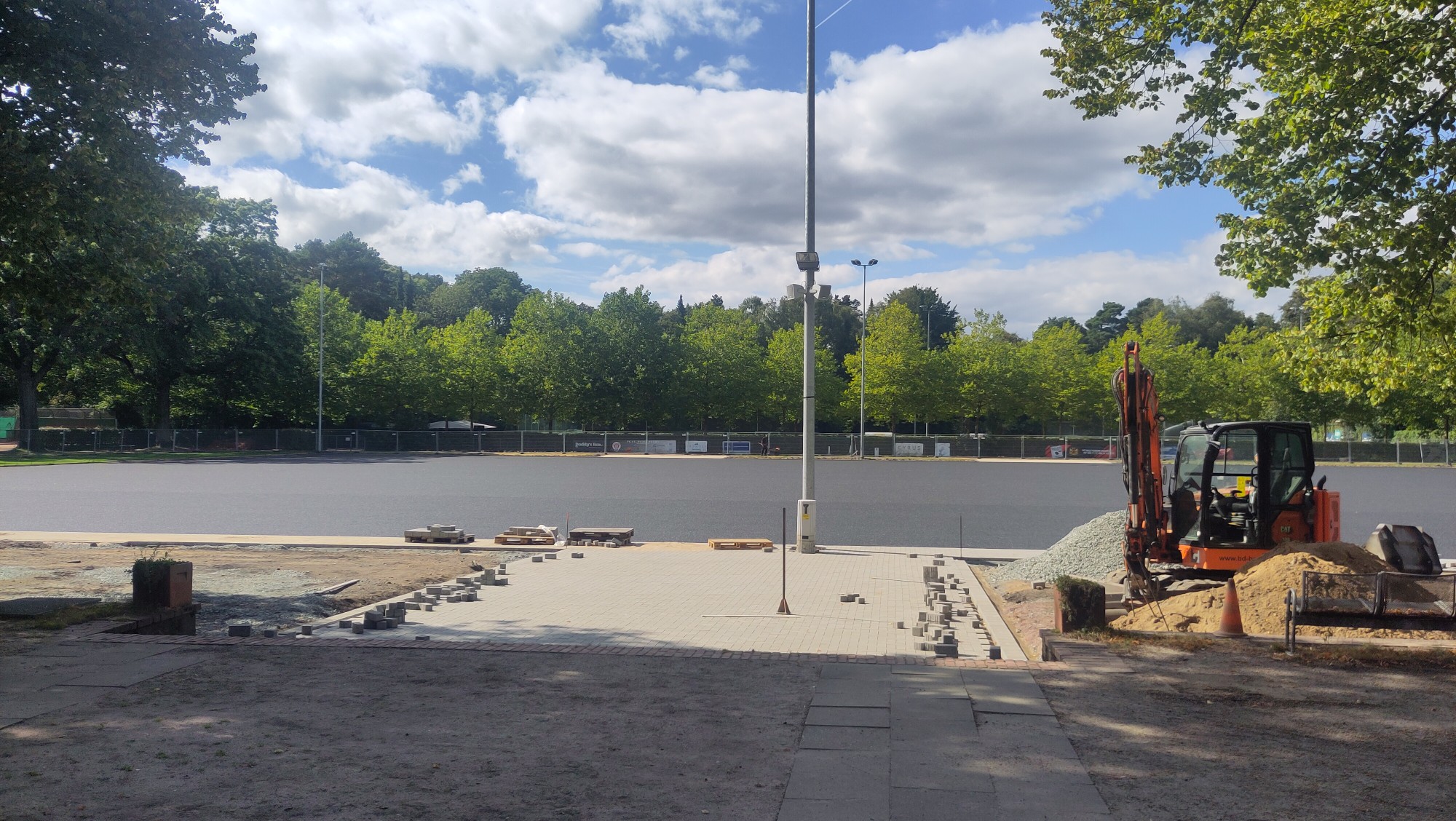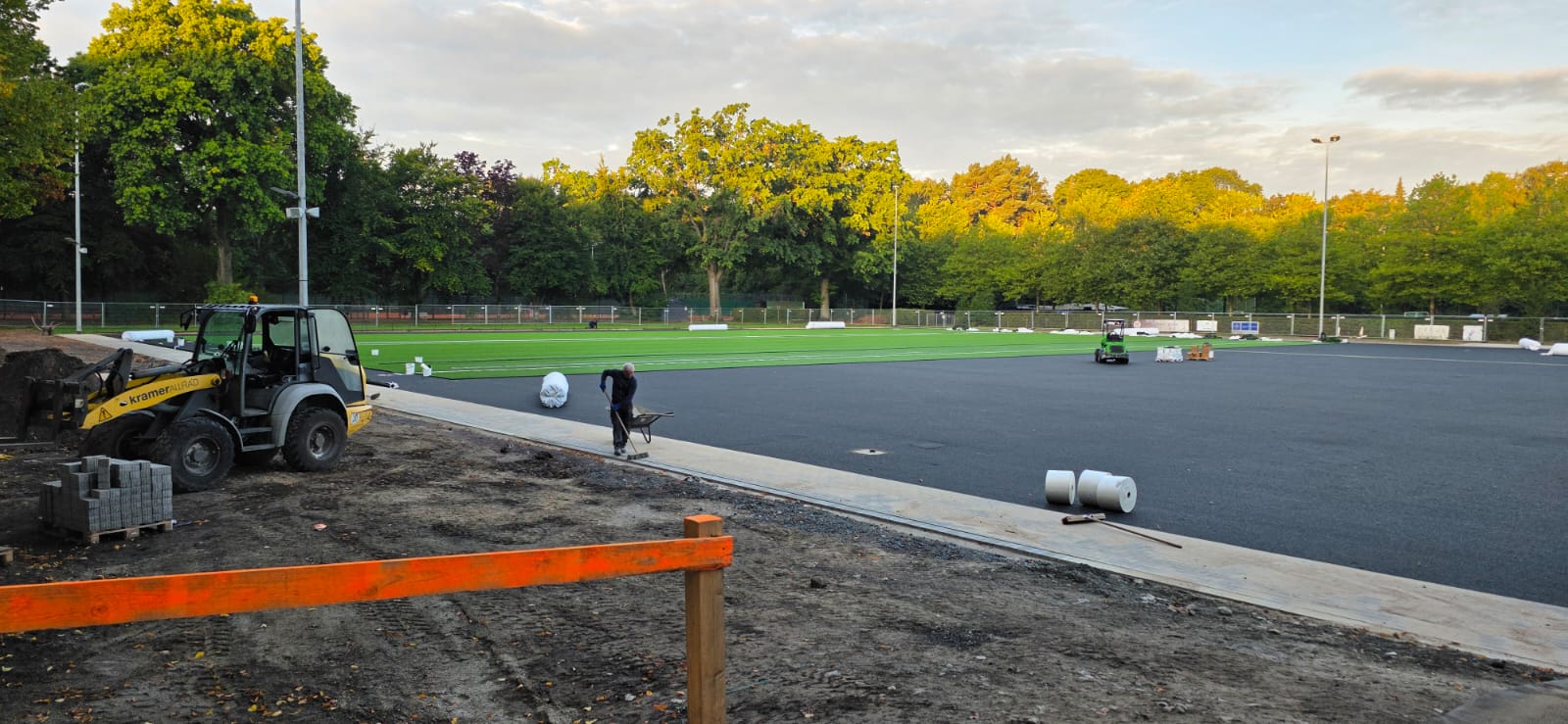 Wer zur Saarlandstraße kommt, sieht dieser Tage vor allem eine Baustelle. Der Platz wird über den Sommer umgebaut, die Anlage bekommt einen Kunstrasenplatz.