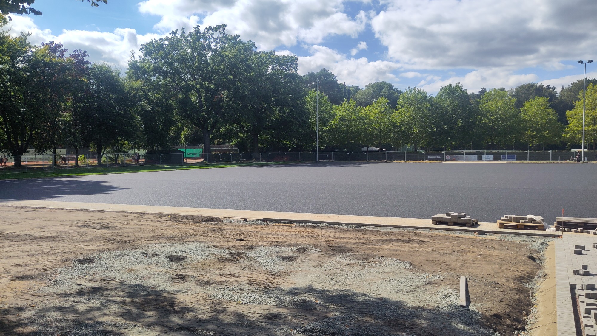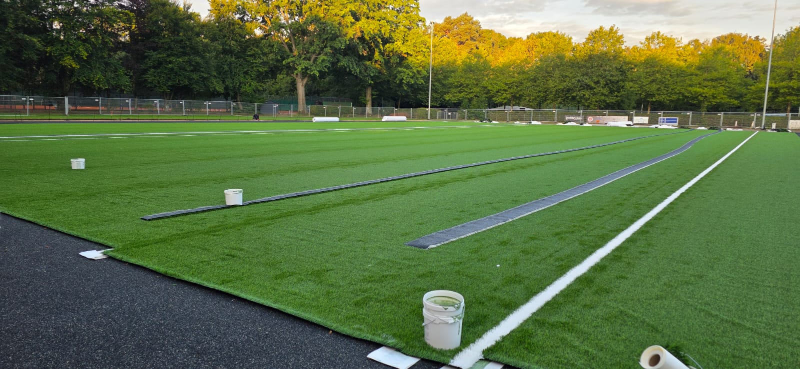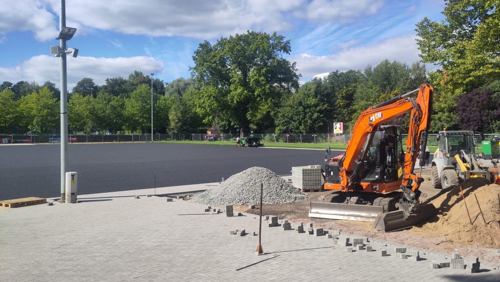 Wer zur Saarlandstraße kommt, sieht dieser Tage vor allem eine Baustelle. Der Platz wird über den Sommer umgebaut, die Anlage bekommt einen Kunstrasenplatz.